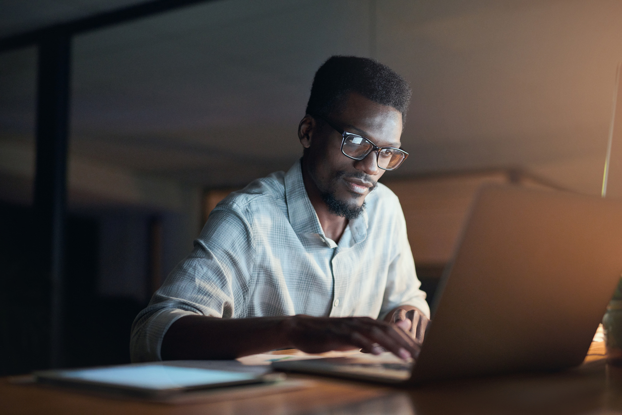 Worker, serious or reading laptop in night office of financial schedule, insurance budget strategy or investment target. Black man, businessman or ideas on late technology or finance data analytics