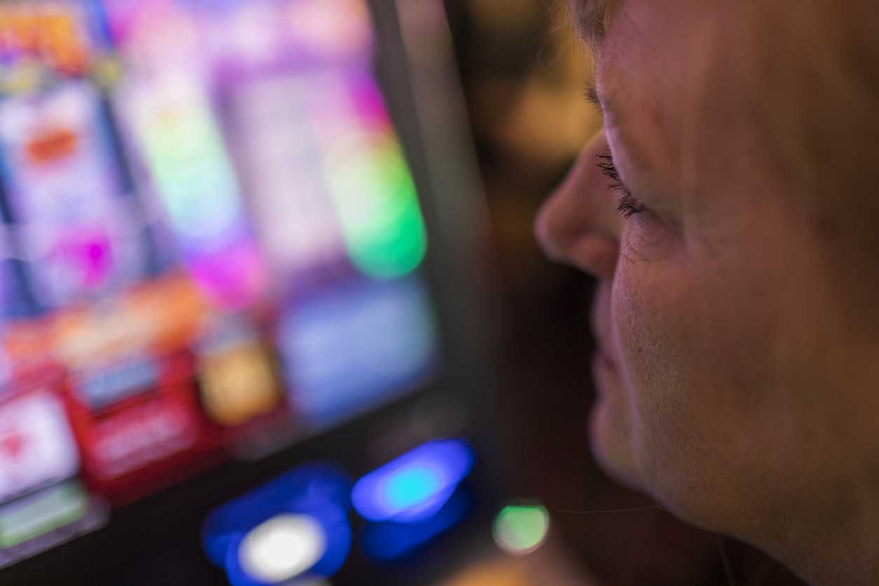 A mature woman, sitting in front of a slot machine, is seriously checking the screen while gambling in a Las Vegas casino.